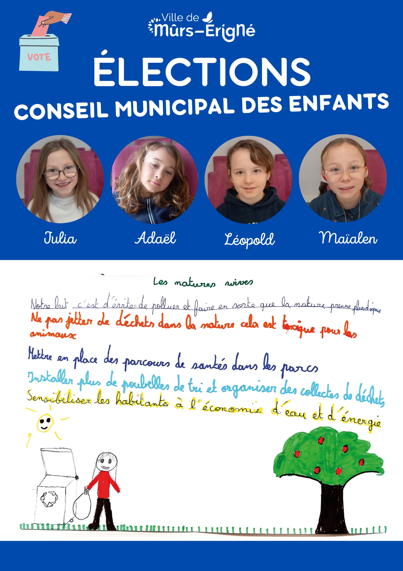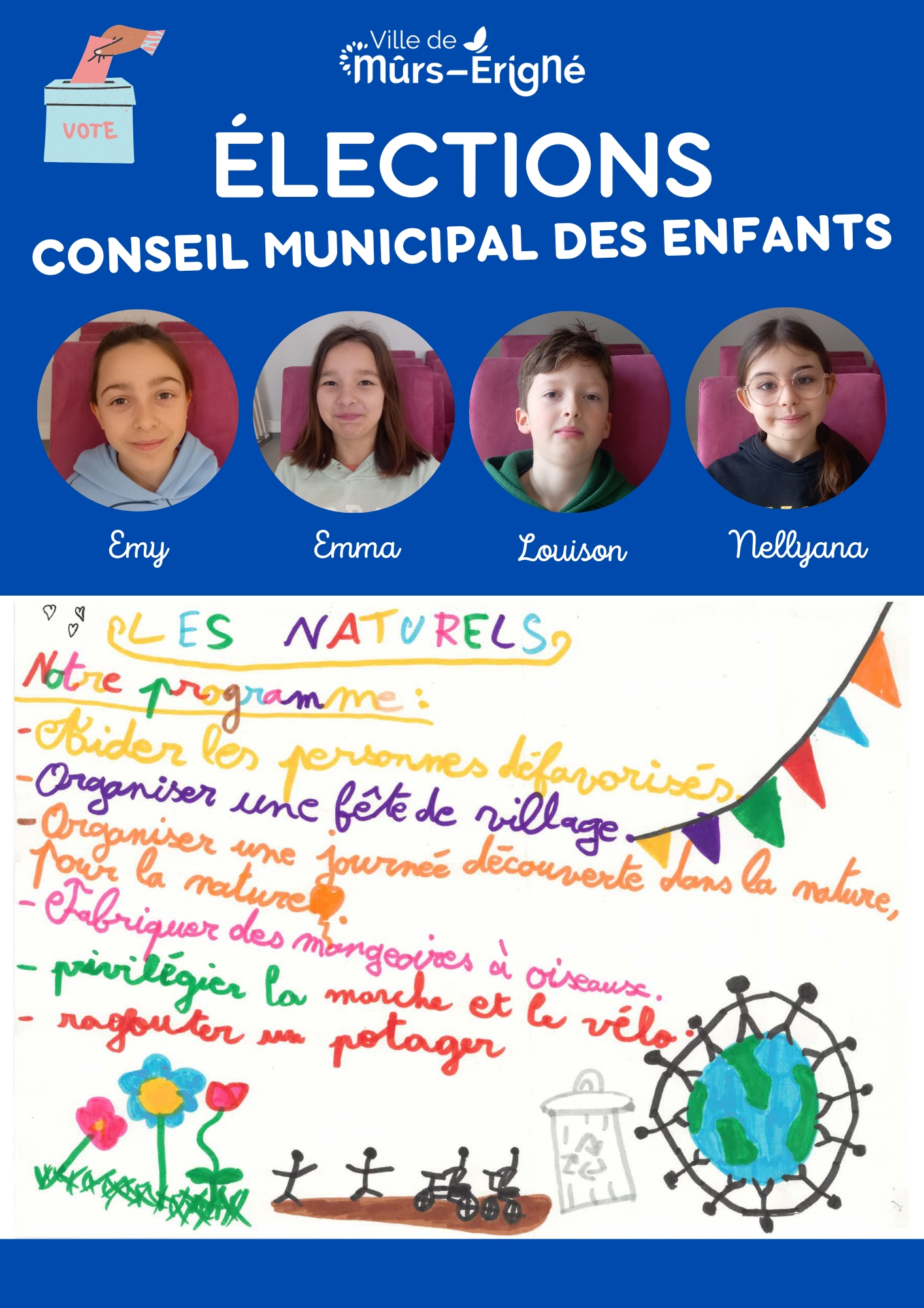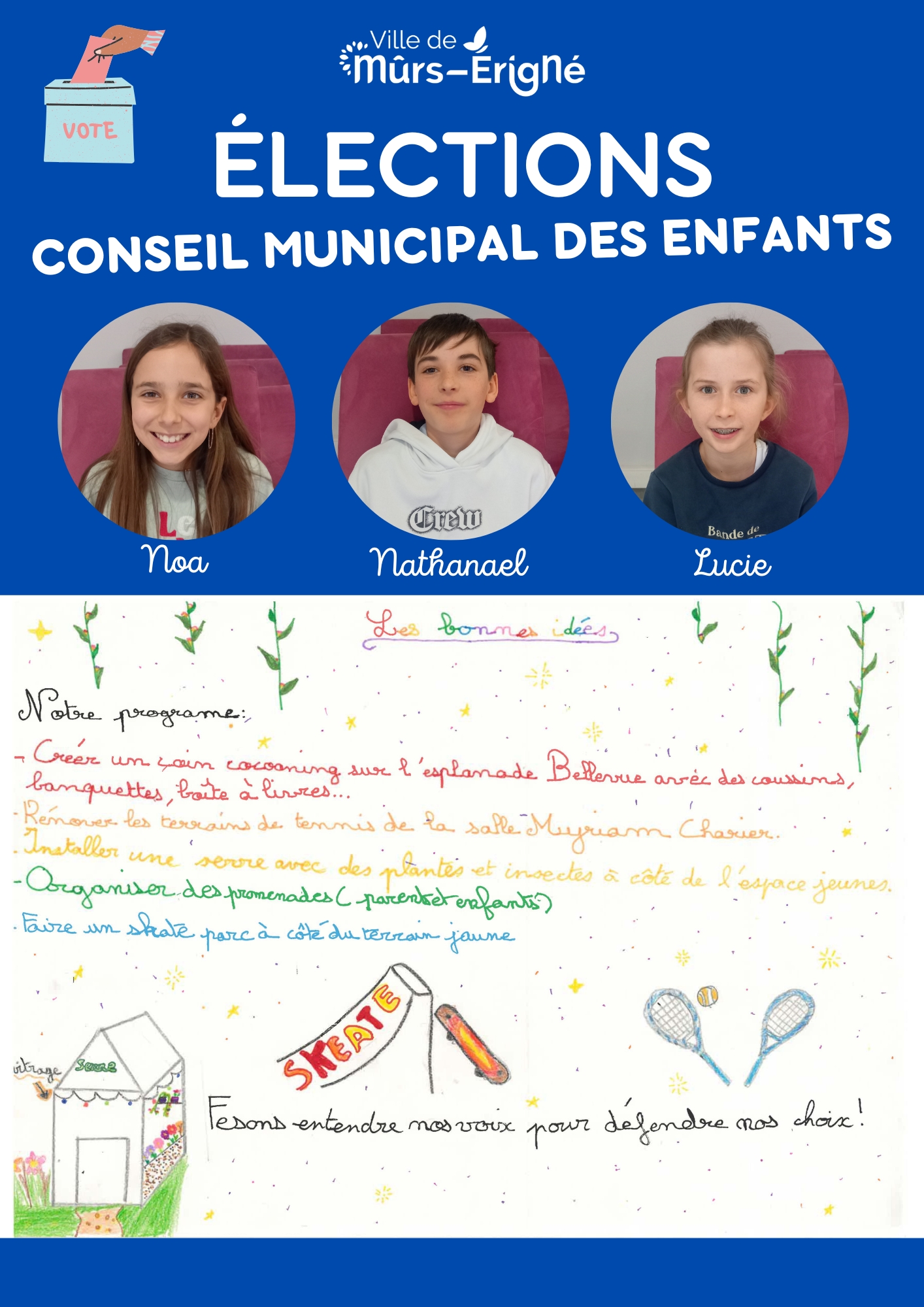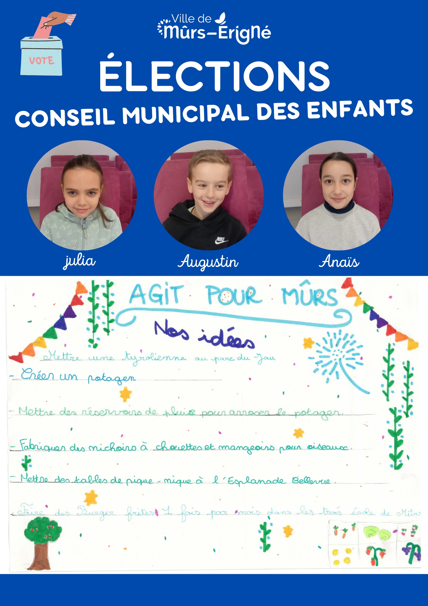 C’est une instance composée d’enfants de la commune de Mûrs-Érigné qui leur permet de :