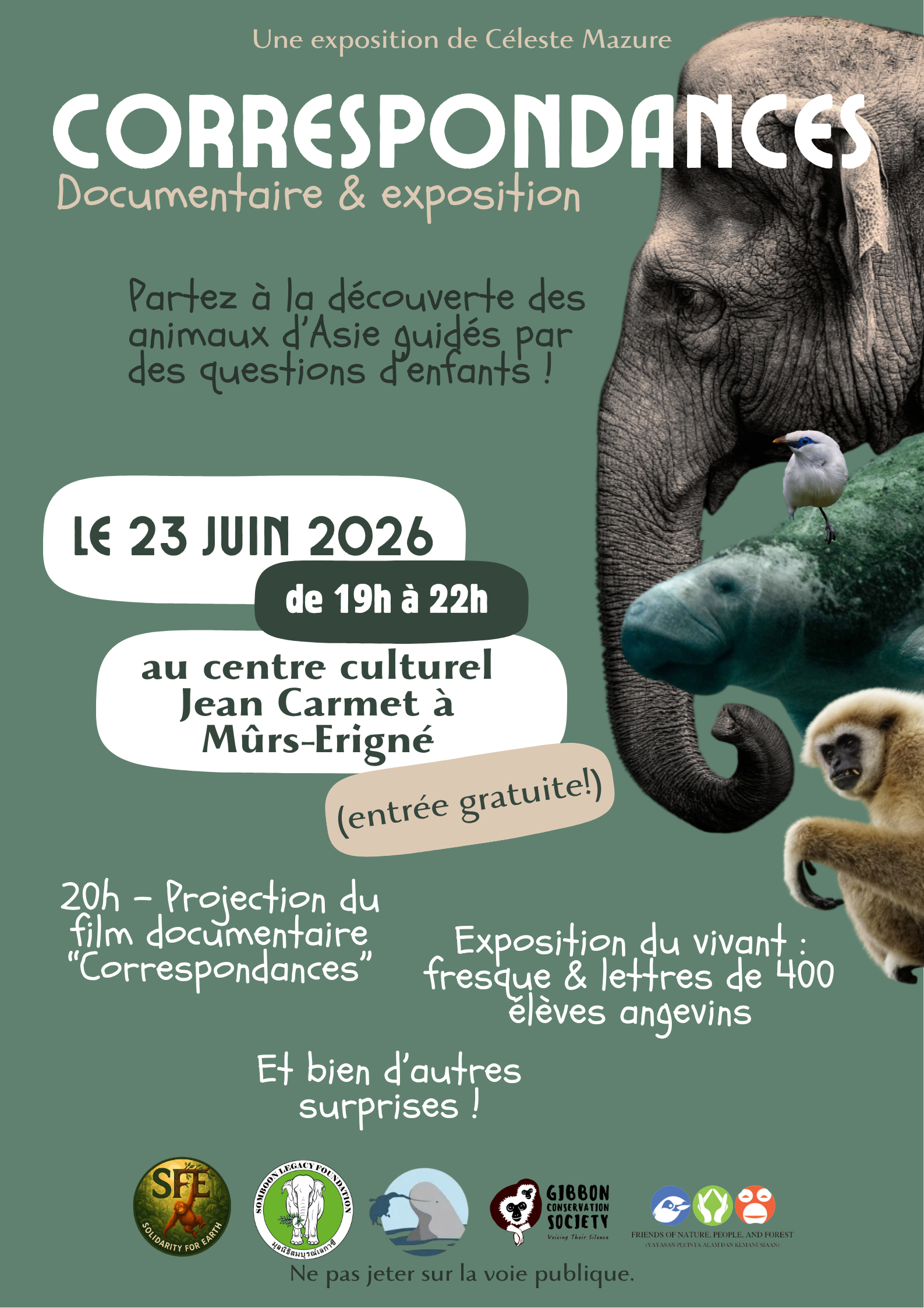 Et si les questions des enfants pouvaient changer notre regard sur le monde vivant ? À travers leurs lettres, cette exposition nous emmène à la rencontre de celles et ceux qui protègent la faune sauvage à l’autre bout de la planète. De ces échanges est né “Correspondances”, un film documentaire retraçant cette aventure, avec pour objectif premier de ramener des réponses aux enfants.